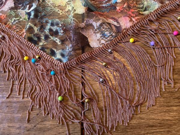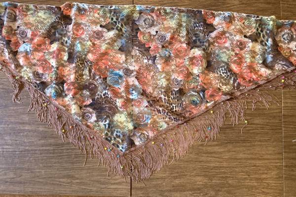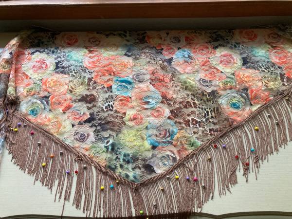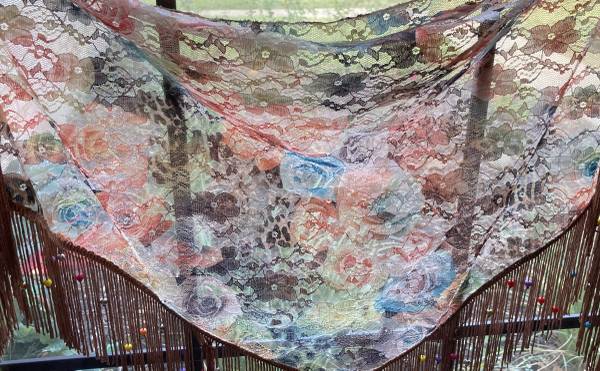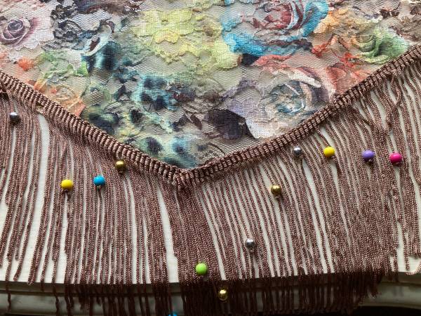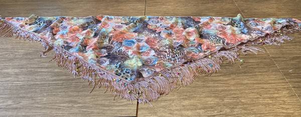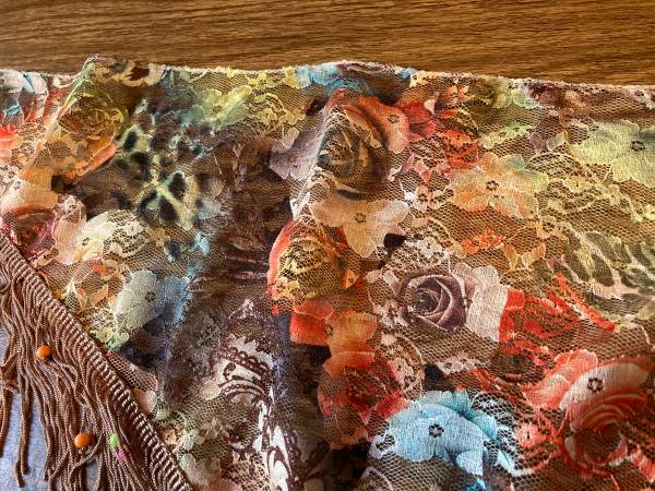 $10. New/Like New. Perfect condition. Beautiful lace detailed with beads and silk fringe. 100% Viscosa fabric. Measures 64" across top edge x 40" along side edges, x 28" from top to bottom point. In...