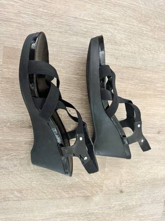 In Great Pre-Owned Condition Ralph Lauren Patent Leather Black Wedge Sandals Stretchy Elastic Straps Sling Back Pull On Heel height 3” S/f home