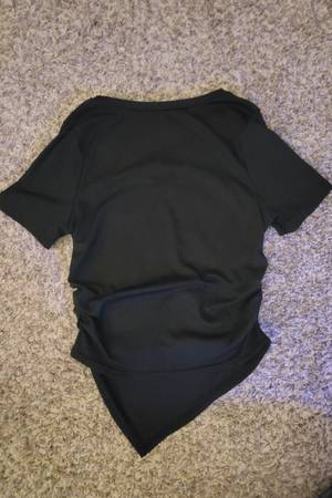 Black short sleep shirt, gathered at the sides, front slightly longer at a curve, says extra large but fits like a medium, 100% polyester