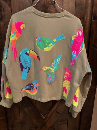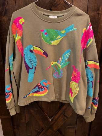 Never worn Queen of sparkle sweatshirt. In amazing condition. Slight dark sage color with bright neon sequins creating some amazing images of birds on the sweatshirt. Size large but queen of sparkle...