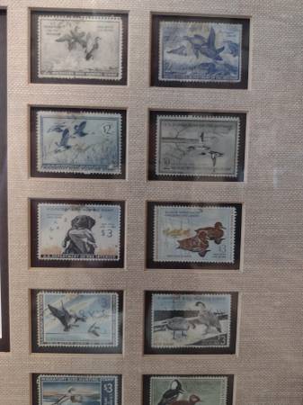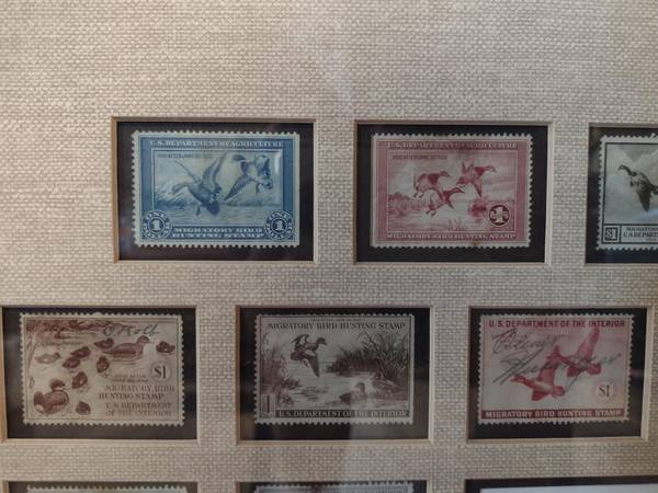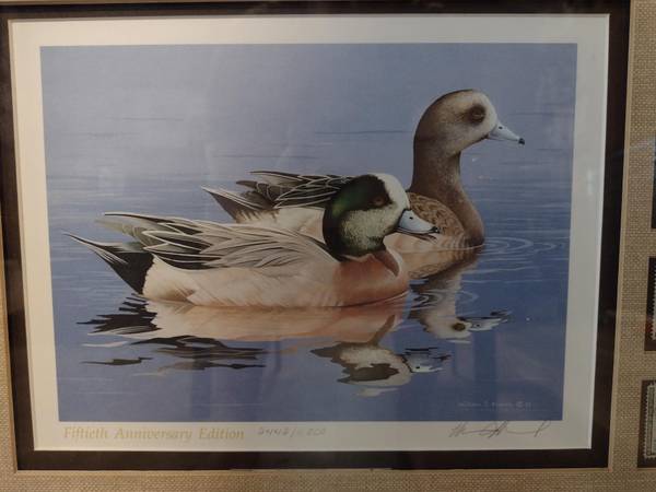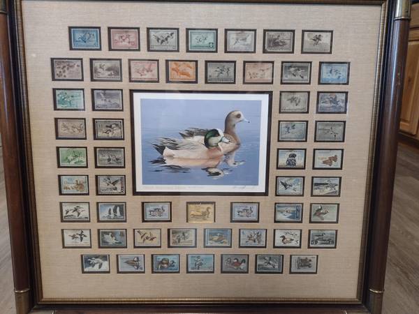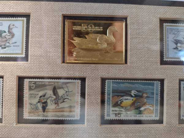 50th ANNIVERSARY EDITION GOLD STAMP - A beautiful collection of US Federal Duck stamps all double matted and framed measuring 27"x30". Includes 53 total stamps from the years 1935-1991, 14 (fourteen) signed, rest unsigned which increases the value. Includes the 50th anniversary gold stamp. Print is signed William C. Morris 1984 and number 2442/11,500. Additional documentation showing original prices included. Estimated Value is $2000 plus framing and matting at $400. Price reduced to $1500, cash only. Will entertain reasonable offers. City of Bandera area. Can ship for additional charge.