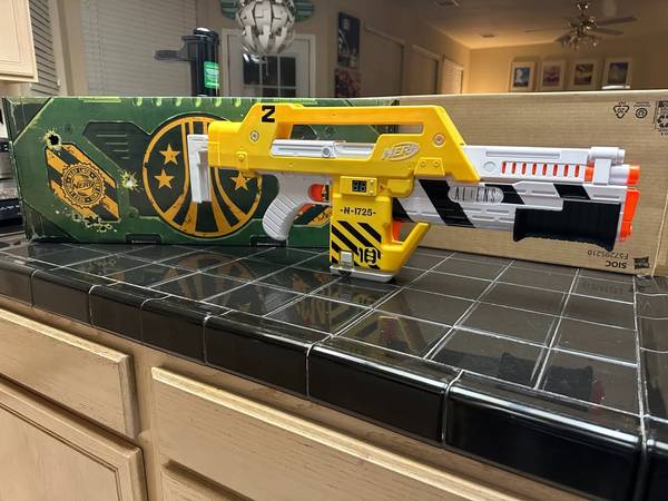 This is a hard-to-find NERF M41A Pulse Blaster toy, from the movie "Aliens". Limited edition direct from Hasbro Pulse, released in 2022, long since sold out. Ordered from Hasbro Pulse in Jan 2023. Highly collectible, easily convert into a cool cosplay or display prop or even display as is. Uses 4 "D" batteries (not included). Includes 10 small darts and 3 large darts. Makes authentic sounds from the movie and has a digital counter that counts down from 99 to 0, just like in the film.