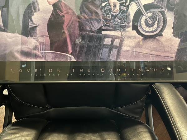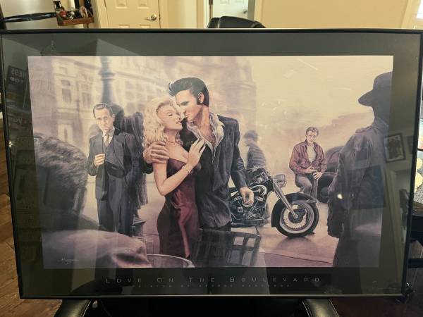 Love on the Boulevard, painting print. Originally painted in 1993 by George Bungarda & includes Elvis, Marilyn Monroe, Humphrey Boggart and James Dean next to a Harley Davidson Panhead. Nicely framed 36 x 24. This is an original print that will compliment any man cave, bar, family room, etc.