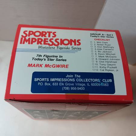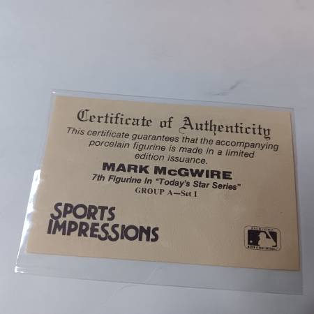 I have the following for sale. Mark McGwire Sports Impressions 6-1/2" Porcelain Baseball Figure 1990 $10.00 This is in Excellent condition. No blemishes on the figure or box. I am located on the NE...