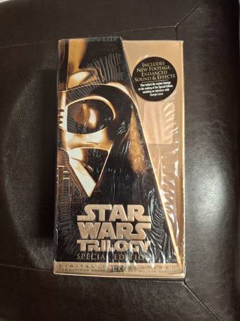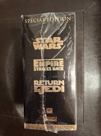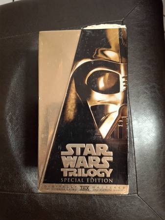 VHS Tapes. NEW IN BOX !! Gold Edition of the Star Wars Trilogy. Never opened !! But the seal is ripped on one corner you can see in the picture the cardboard is ripped on the edge $50.00