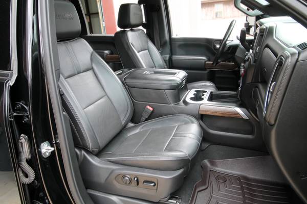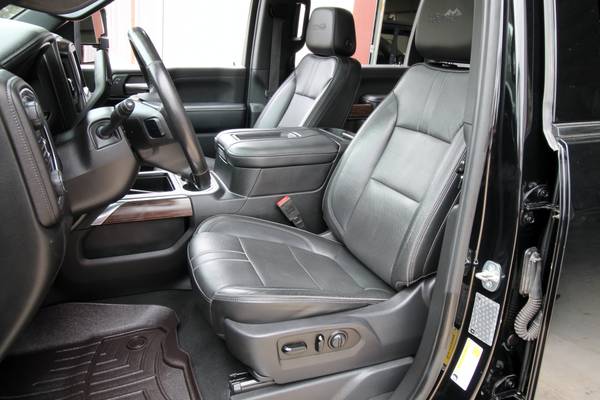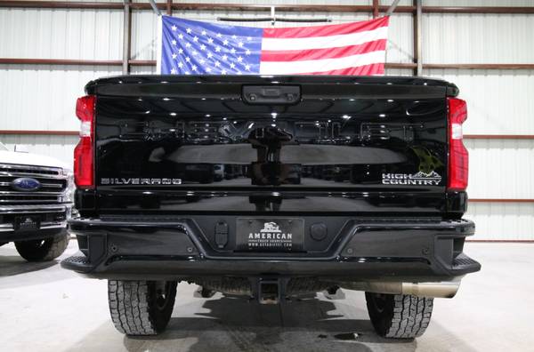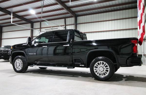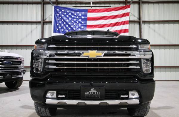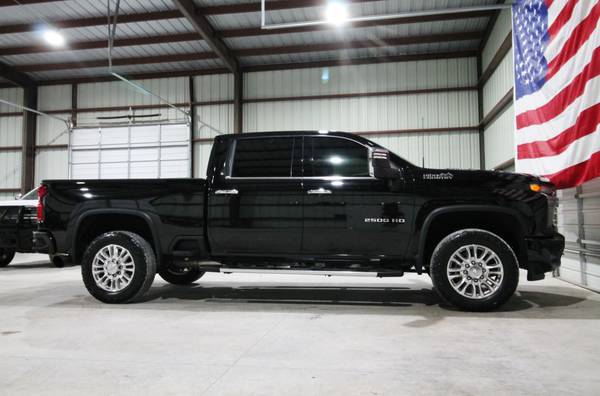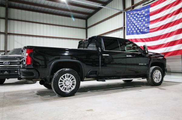 For sale is a stunning 2020 Chevrolet Silverado 2500HD High Country 4x4 equipped with the powerful 6.6L Duramax L5P diesel engine paired with the Allison automatic transmission and electronic four-wheel drive. This Texas truck has 123k miles and comes with 32 detailed service records reported to Carfax, showing excellent maintenance. It has never been lifted or leveled and sits on like-new Cooper AT tires. This hard-to-find black-on-black High Country features a factory gooseneck hitch, factory LED headlights and tail lights, 360 cameras, blind spot monitors, and a clean, sharp exterior. Inside, the High Country Deluxe Package includes premium saddle leather, heads-up display, lane departure alert, collision warning, auto high beams, dual power heated and cooled seats, a fixed center console, a large factory touchscreen with navigation and backup camera, a sunroof, electronic 4x4, and a built-in trailer brake. This truck truly has it all—power mirrors, power windows, power locks—and is exceptionally clean inside and out.