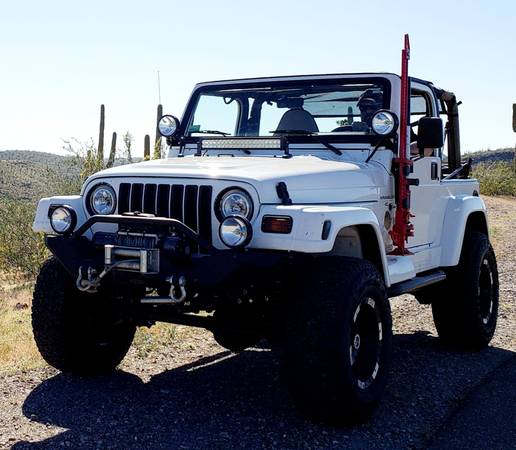 Good condition Slightly lifted 99 Jeep Sahara 4x4 6cyl automatic .Has like new tires , soft top. Upgraded suspension . New winch , Light Bar , etc .This jeep get driven regularly.