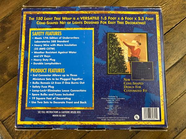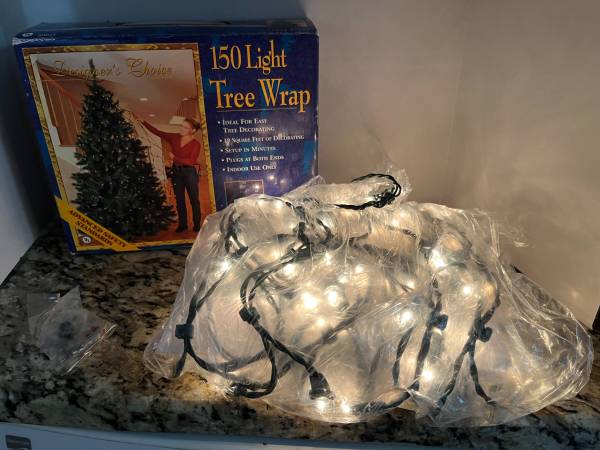 New in opened box, never used. We have moved into a small apartment / condo, so no room for a big tree. Lights are tested, and this set does include the replacement bulbs and fuses. SEE ALL PICS:)...