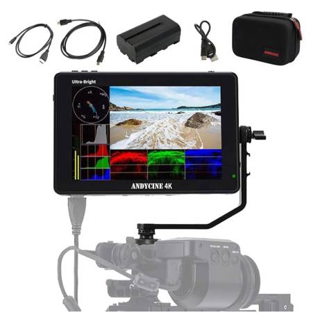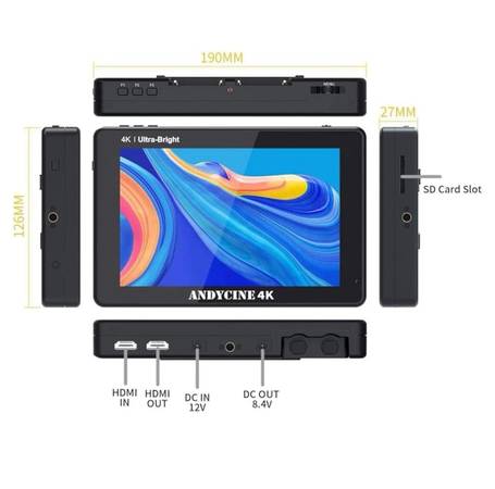 Its 2200-nit IPS panel is Ultra Bright, so you can see it clearly even in direct sunlight. It has a beautiful Rec 709 color-calibrated, auto-dimming touchscreen display, and it accepts 4k in with 4k loop out while displaying at 1920x1200 (plenty for 7"). You can swivel the display for clients or crew or even flip the display and image if you're vlogging.