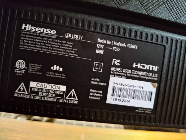 Model 43R6E4 about a year old, led, lcd, 4k uhd, wifi enabled for streaming channels and apps. Location is far south San Antonio.
