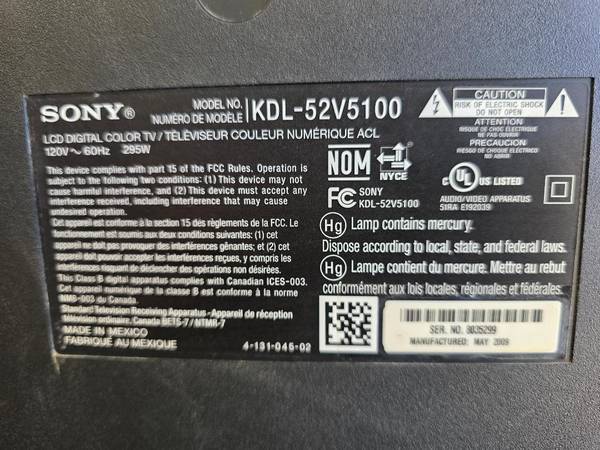 I have a Sony Bravia 52 Inch TV for sale. It was mounted in the our game room and very seldomly used. I did turn it on to make sure everything works. All functions work perfectly and the picture is great. I am asking $65. Please text Chris @ show contact info