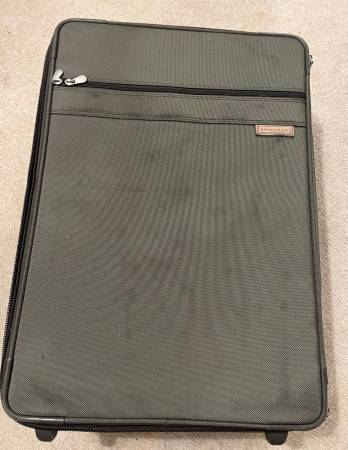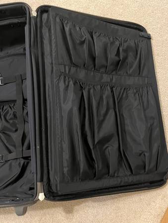 Large suitcase has bag for hanging clothing that can be removed if desired.