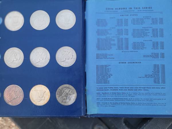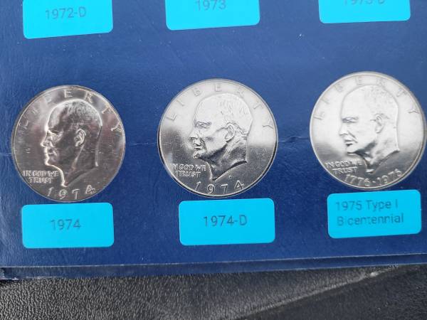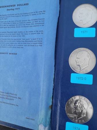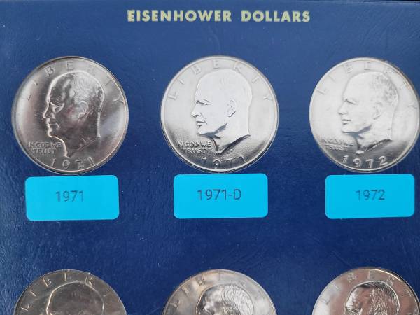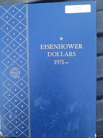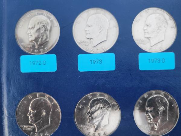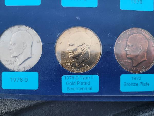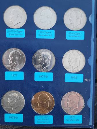 Complete set of Eisenhower clad business strike dollar coins. Including one 24k gold plated dollar and one bronze plated dollar. In a vintage Whitman album. Cash only.