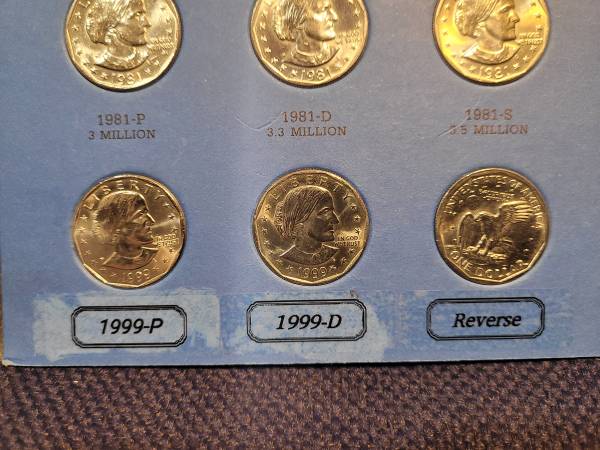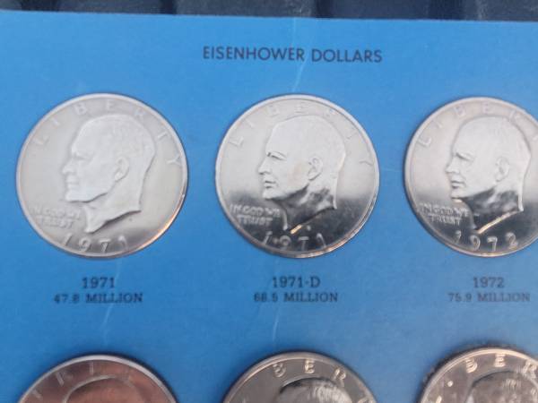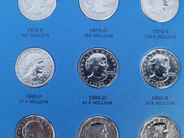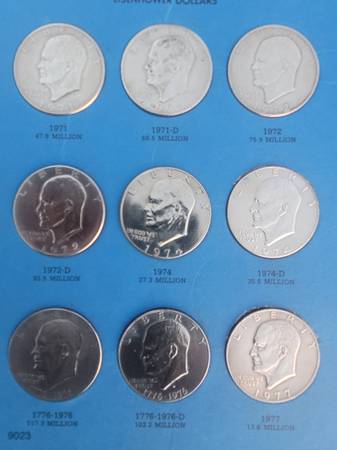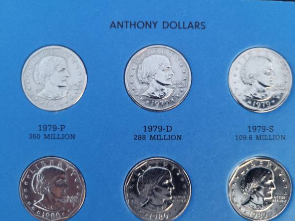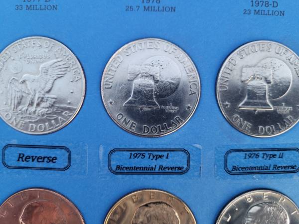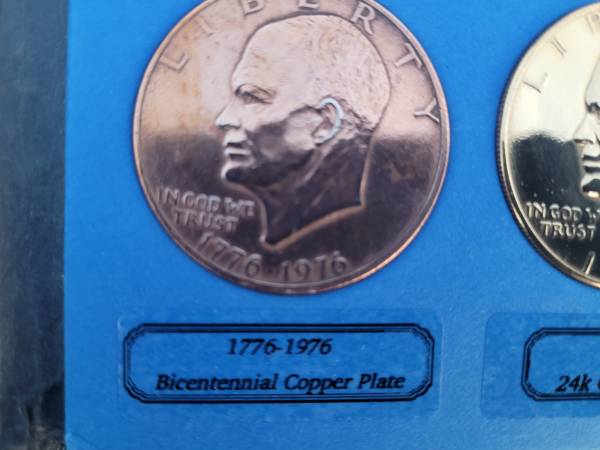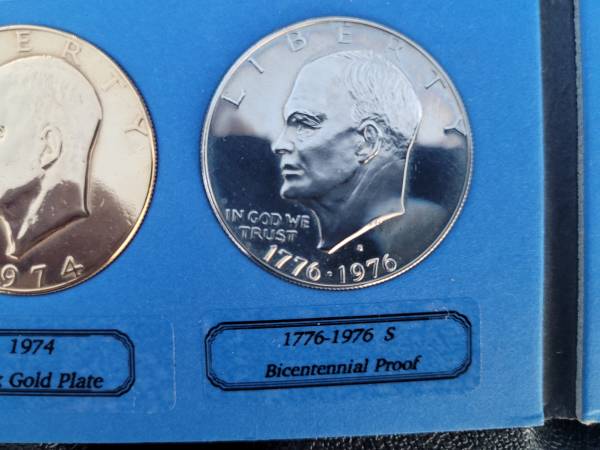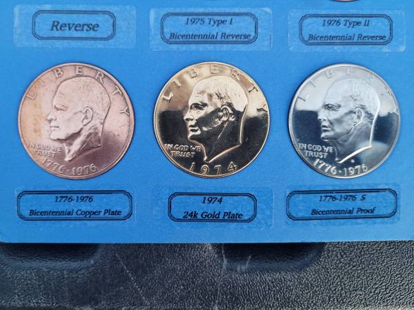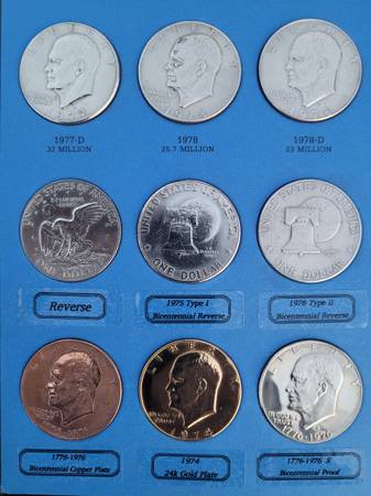 Complete set of Eisenhower & Susan B Anthony business strike clad coins including one copper plated Bicentennial coin, one 1974-P 24k gold plated coin and one 1976-S Bicentennial clad proof....