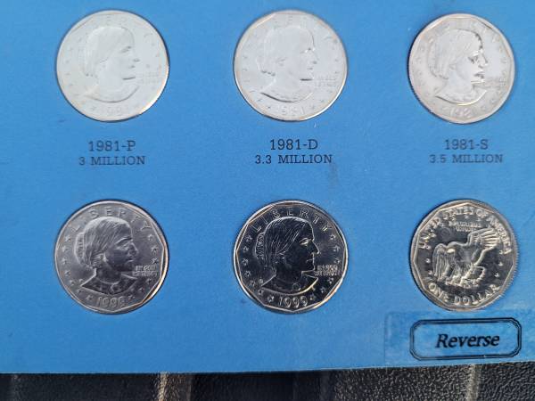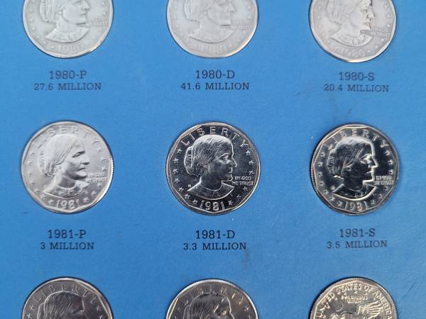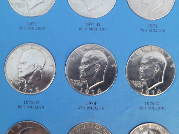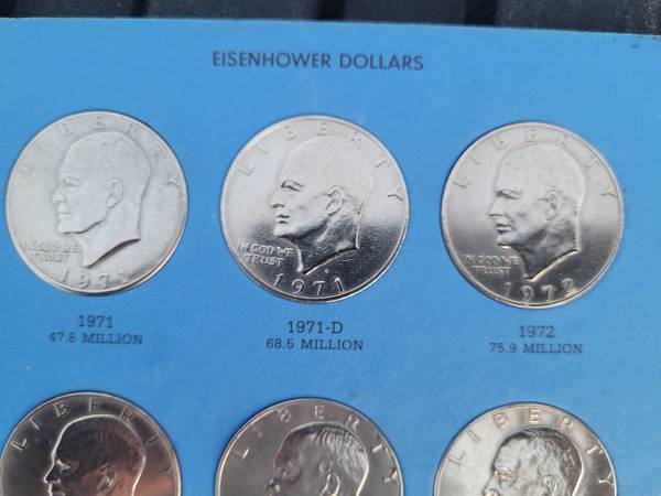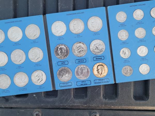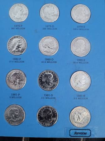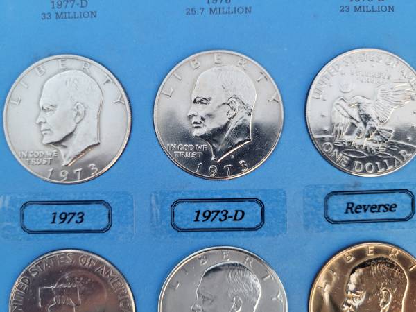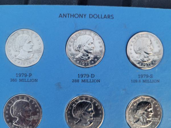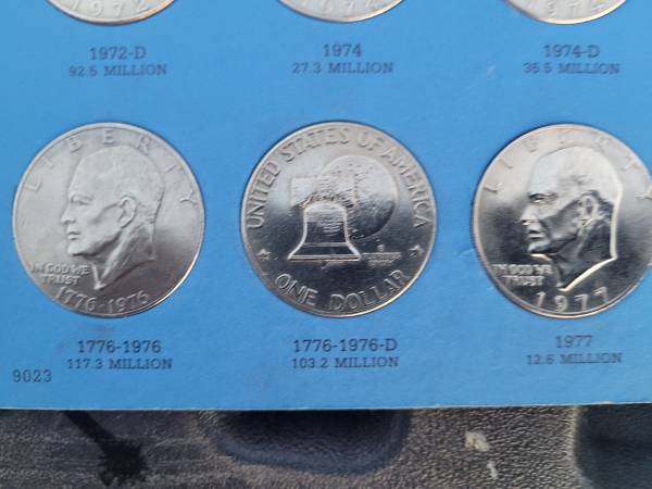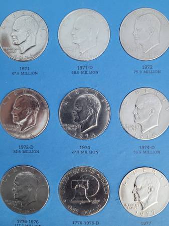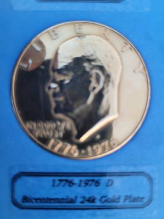 Complete set of Eisenhower & Susan B Anthony business strike clad coins including one 1971-S 40% silver coin & one 1976-D 24k gold plated Bicentennial coin. Cash only.