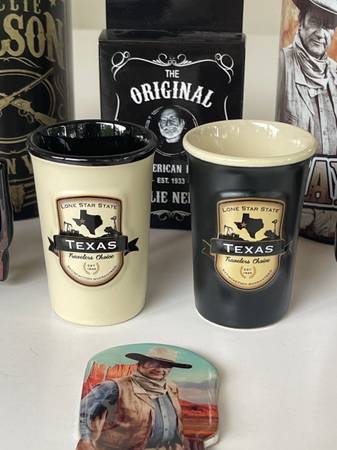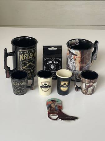 Fun collection of Willie Nelson & John Wayne accessories. Two mugs. 4 shot glasses. Playing cards. Bottle opener. Value = $100 + Great price!