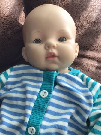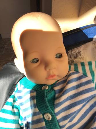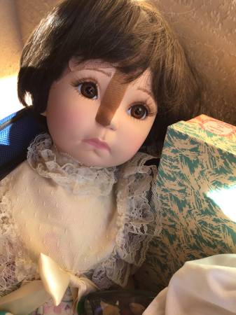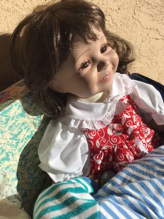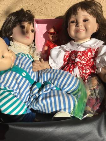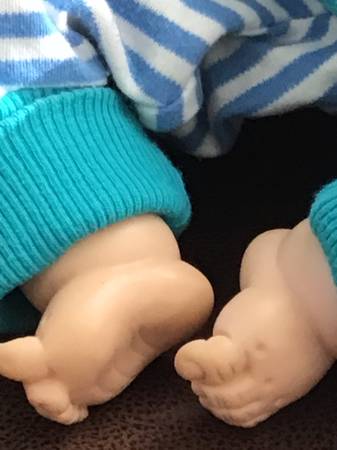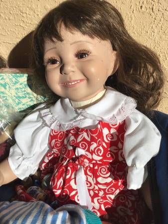 The 2 porcelain dolls also have a soft body core, but the face and limbs are porcelain. These dolls were part of the Any Baby Can Collection and cost over $1,000 each. One doll was injured and thus, the band aid. They are so realistic and so easy to love! $20 each or all 3 for $50 cash