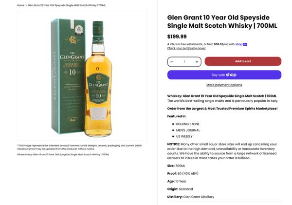 1 - Glen Grant 10 Year Old Speyside Single Malt 700ml (European only) - $100