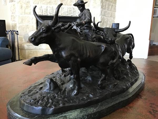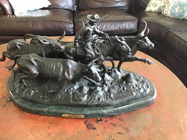 American Bronze Sculpture on marble base; 34" x 16" x 15"; this was Frederic Remington's last sculpture. Caution--when comparing bronze sculptures on eBay (and elsewhere) keep in mind that many bronzes are foreign made which means it is 55% (or less) copper compared to American bronzes which are 95%+ copper. Besides price, be mindful of quality and origin of the bronze. A cheaper price is often indicative of an inferior piece of art for several reasons.