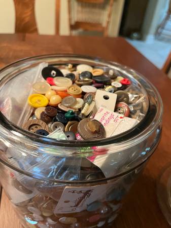 Glass Jar filled with various sewing supplies including buttons and threads. Jar lid has chip. Glass Canister Jar is 7x8