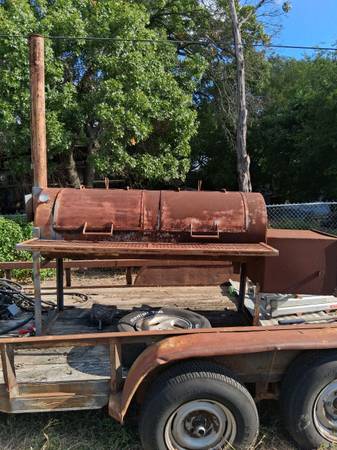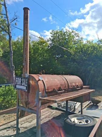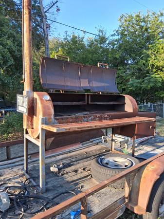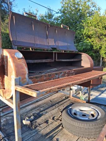 Lifetime BBQ pit with smoker box. Thick metal, very large, very heavy. Trailer not included. Must have your own means to move it. TEXT ONLY