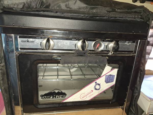 New camp chef oven, still has stickers, never cooked on, works perfectly. Has a camp chef oven carrying case.
