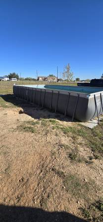 Pool with pump, floaties, chemicals, brushes, nets, and poolside storage baskets. Pool is 2 years old and in good condition.