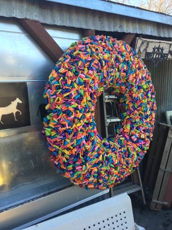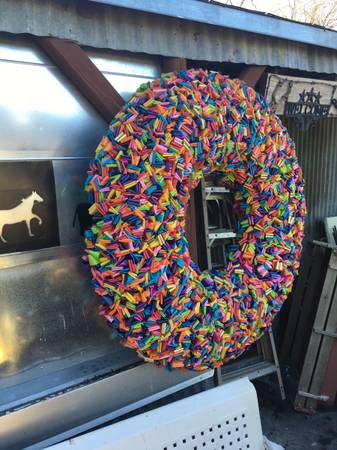wreath is made from 15 pounds of plastic ribbon and the rest is made from a very strong foam form and steel wire. Overall it weighs just over 20 pounds and it comes with a tail that...