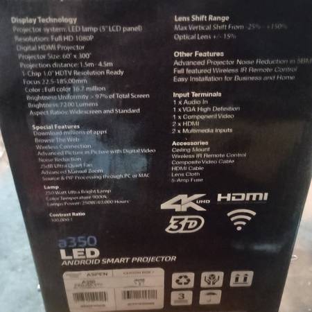 I have a like new Aspen Projection a350 Android LED 4k Smart Projector with integrated wifi, HDMI connection, 3D capable, can connect to TV, computer, tablet, phone etc and a great bargain at just $200 plus I'll even throw in a new 100'in projector screen(worth $100 by itself!) While when compared to what others charge at $430 and those are all sold out! This deal with 55% savings won't be around long so if interested you can contact me at 210 331 4two10 serious inquiries only please don't miss out!
