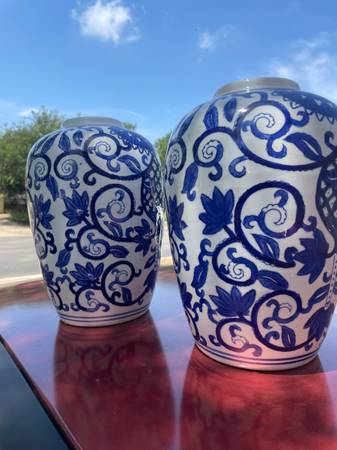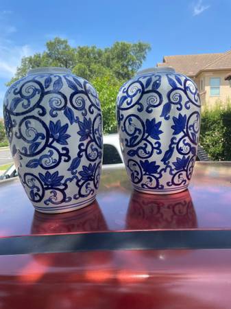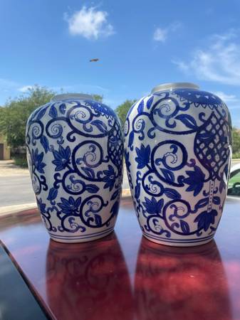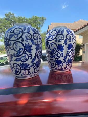 (2) Blue &White Vases 12 inches tall *All proceeds will be donated to the San Antonio Humane Society and the Wildlife Rescue in Kendalia.