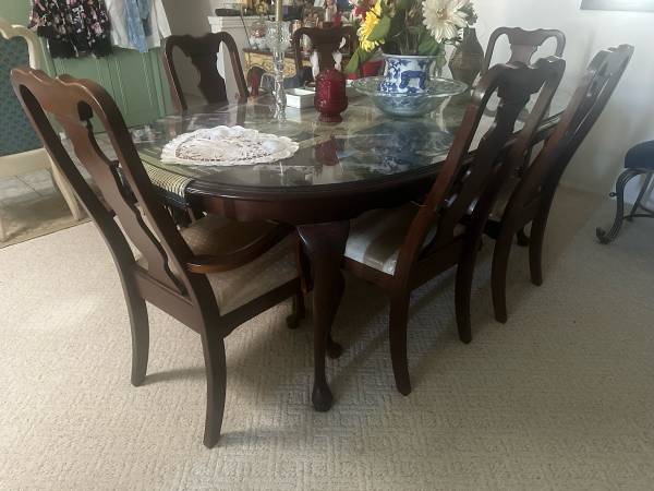 Have very beautiful dining room table w/ leaf insert and 4 chairs. Table with out leaf has added glass piece that was cut just for this table. Also have China Cabinet with 3 drawers and 2 cabinets. Top part of china cabinet has 1 large door with 3 shelves - 2 of the shelves are glass and everything is in excellent condition as it was in the store. Please only serious buyers!