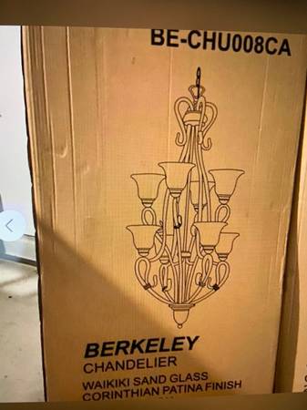 Richness emanates from this Vaxcel Lighting Berkeley BE-CHU008CA Chandelier, particularly through the glamorous Waikiki sand glass shades and artfully crafted steel frame. Requires eight 100-watt incandescent medium base bulbs (not included). Missing small screw
