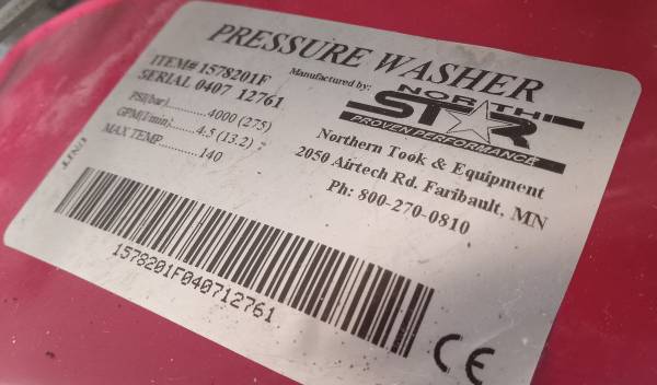 NorthStar Commercial Pressure Washer, Model #15782020, Item #1578201F, Ser #040712761, 4000 PSI, Honda GX 390-389cc OHV engine for reliable and performance, CAT-66 DX-Direct drive triplex pump for superior durability, premium push-down style steel cart with roll cage for smooth balanced maneuvering and protection. New flat free tires, 50' hose and wand, easy start prevents pressure build-up for smoother, easier recoil pulling, both engine and pump oil just changed. Flushed out both gas tank and carburetor. When this item first sold it was for $2000. Today, I'm asking for $800.00. CASH ONLY. Call Jake or text @ show contact info