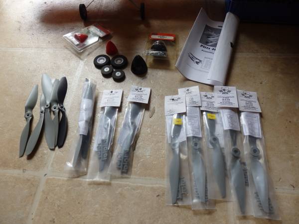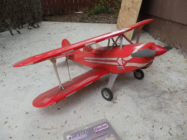 This aerobatic Bi plane has a Hacker brushless outrunner motor with spare shafts, Castle Thunderbird 18 ESC, lots of spare props and spinners of different sizes for different power combinations. includes spare wheels, original paperwork, micro servos and one Thunder Power 3S 2100mAh battery. all you need is a transmitter, receiver and charger. just plug in your receiver and it's ready to fly. 4 channel, rudder, elevator, aileron, throttle.