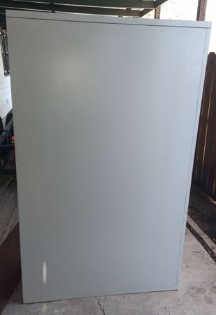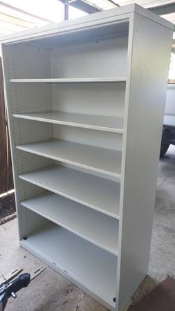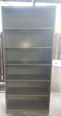 Metal shelves cabinets with adjustable shelves. Great condition and no rust anywhere..where used indoors all the time. $100 ...Great for extra space. Light brown in color Brown dementions 80 in...