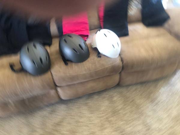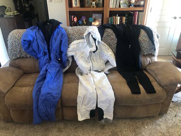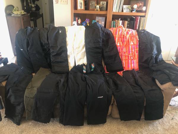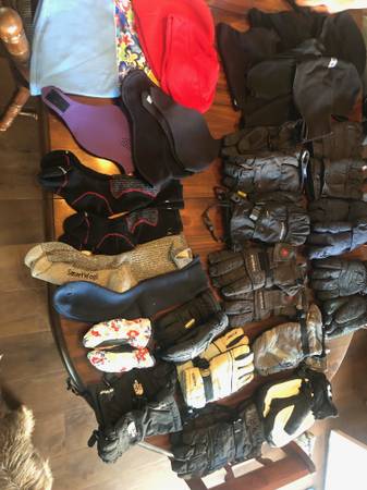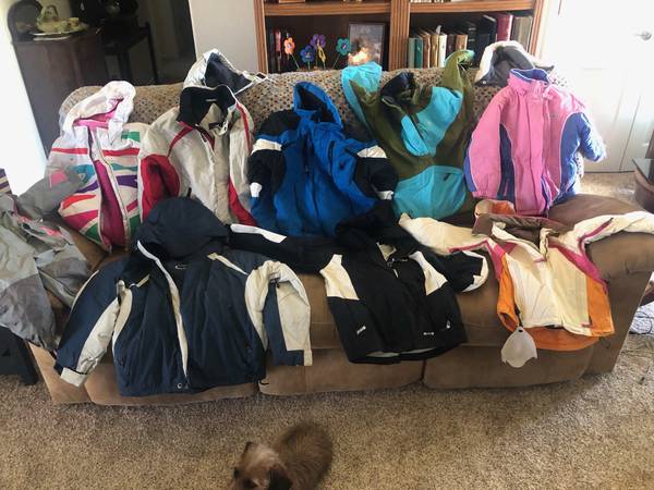 assorted child and adult ski apparel - pants, jackets, gloves, helmets