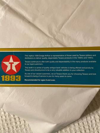 Texaco 1939 Dodge Airflow Locking Coin Bank with Key Die Cast Metal New IOB from 1993 *All proceeds will be donated to the San Antonio Humane Society and the Wildlife Rescue in Kendalia.