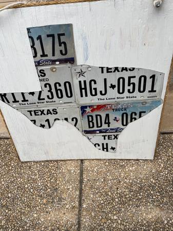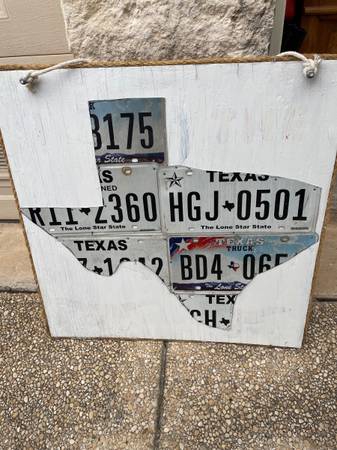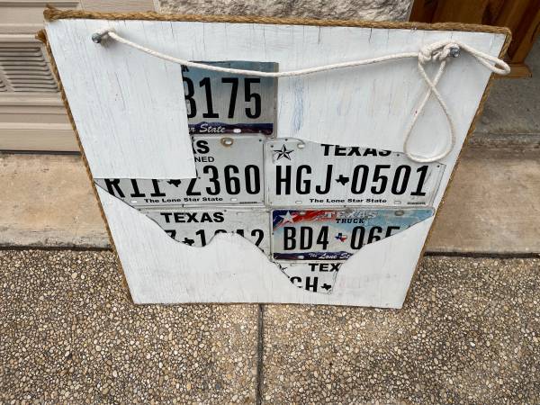Texas License Plates formed in the State of Texas mounted on plywood with rope trim and rope to hang. 24 inch x 24 inch *All proceeds will be donated to the San Antonio Humane Society and the...