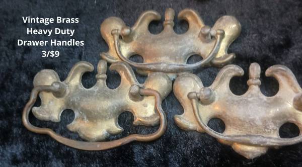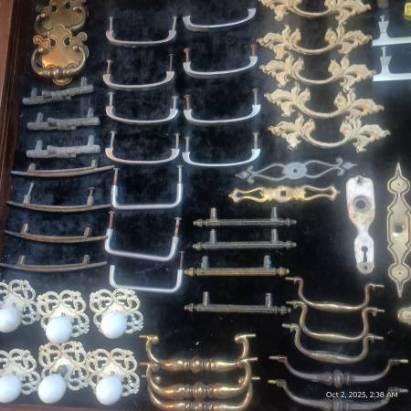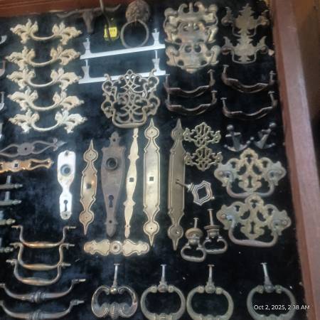I have a large assortment of vintage/antique furniture hardware mostly brass with some cast aluminum from handles,knobs, accents,hinges and more the variety and in many cases rarity of some of these pieces makes them all the more unique. I'm selling as matching sets with various prices based on style,age,and rarity some of these sets have 2 or 3 pieces to the set others 12 pieces or more . Not all hardware is pictured pictures,. I'm also open to any reasonable offers on all which is over 200 pieces of vintage andor dresser, cabinet, door and box/trunk hardware 6⁶