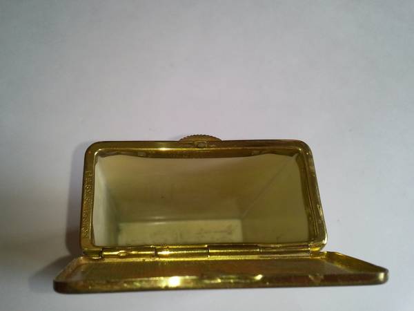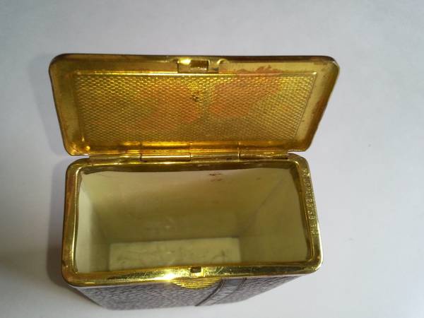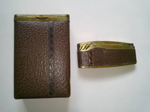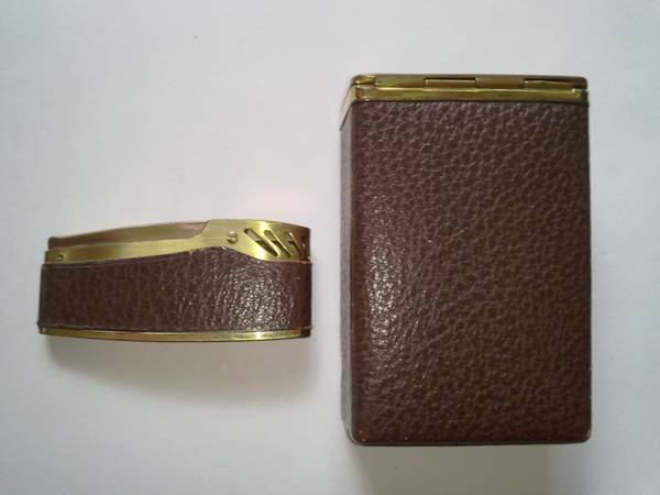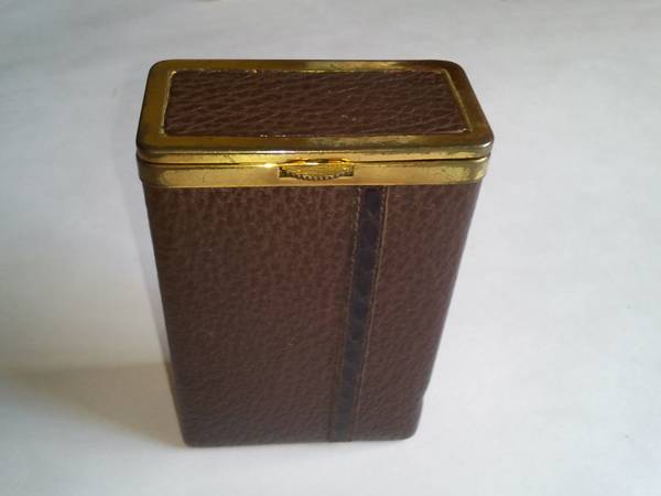 Up for sale is a Vintage Princess Gardner Cowhide Flip Top Cigarette Case w/ Lighter. The top of the case has golden metal frame. The case has a gold imprint "PRINCESS GARDNER" at the bottom of the case. The case measures approximately 2.25" W x 3.5" H x 1 3/16" D. It shows stains and wears on the inside opening flap and the white interior. The cigarette lighter shows lots of wears on the golden parts. The lighter has matching brown leather cover matching the case. Overall in good used condition, please view all photos to verify its condition and appearance.