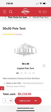 Heavy duty 30 by 30 pole tent for sale. Kept in heavy duty metal job box. No rips or tears. Been used a dozen times. Over 6,000 new asking 3,000 or best offer. Pick up only.