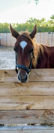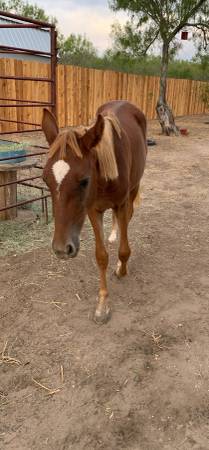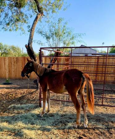 Young female horse, approx. 1 year old. Breed unknown. Halter broke and easy to lead. Raised on pasture. Calm and curious—great potential for someone ready to guide her.