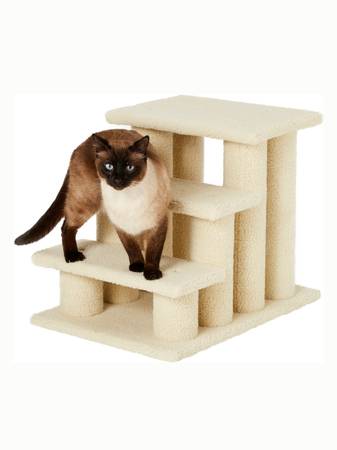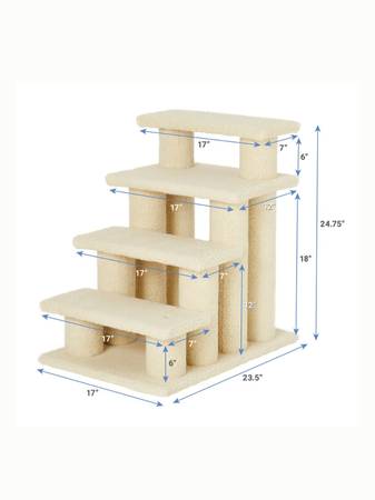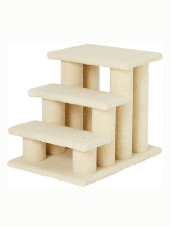 Adjustable pet stairs can be 3 steps (18.5 inches tall) or 4 steps (24.5 inches tall). Supports up to 120 pounds. Carpeted in cream-colored fleece fabric. Brand new in unopened box.