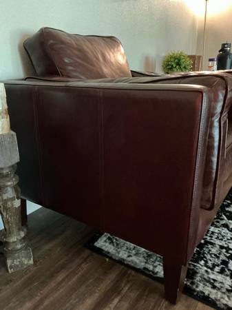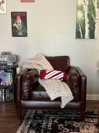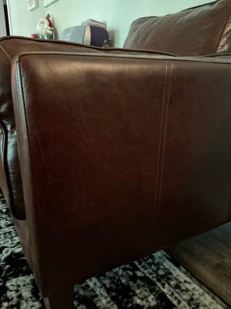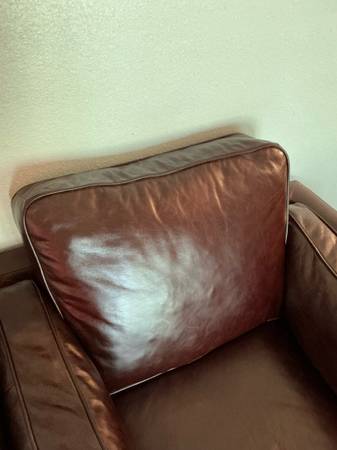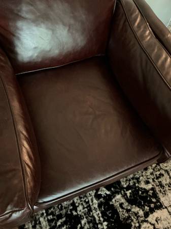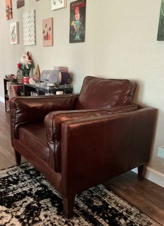 This is a used genuine leather armchair. It is in great condition and barely ever used. There are a few scratches as shown in the photos. This was bought brand new for $1,291 but asking $800. Located in Boerne. Local pickup or meet up! Non-smoking household!