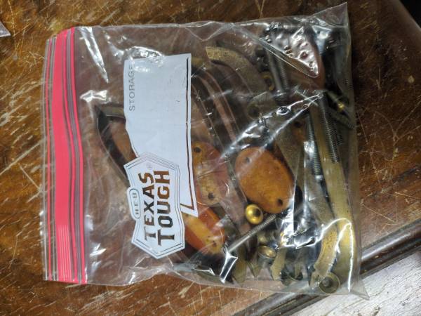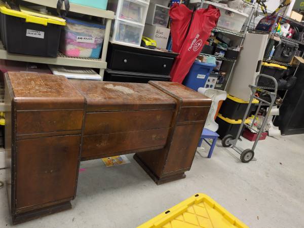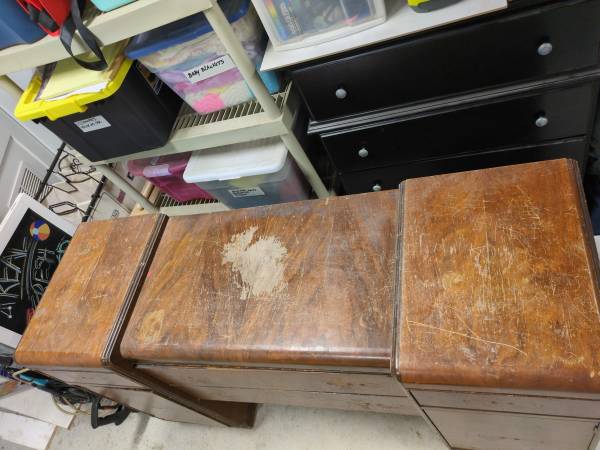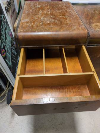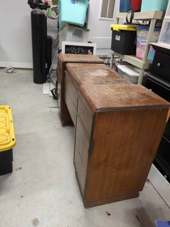 Solid hardwood through out. Hardware already removed (but present) and it is ready to be sanded and stained or painted. Cupboards and drawers all work good. 5l2 -943-2825 35.5" tall x 62"wide