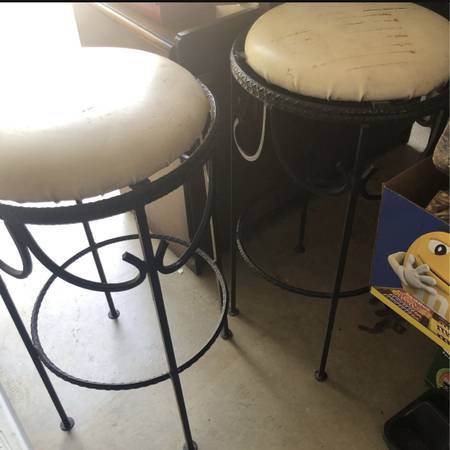 Wrought iron stools Bar height Can easily be reupholstered or Repurposed… I’m thinking plant stands 🪴 Cash only MPU