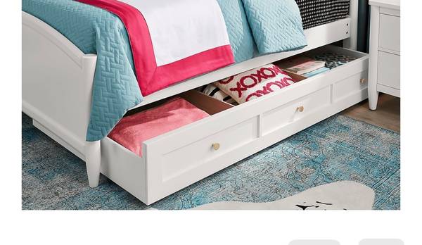 White twin size storage trundle from Rooms To Go. (It can be used as under bed or storage) it's an excellent place to store out-of-season clothes, extra blankets or toys, or even an extra mattress...