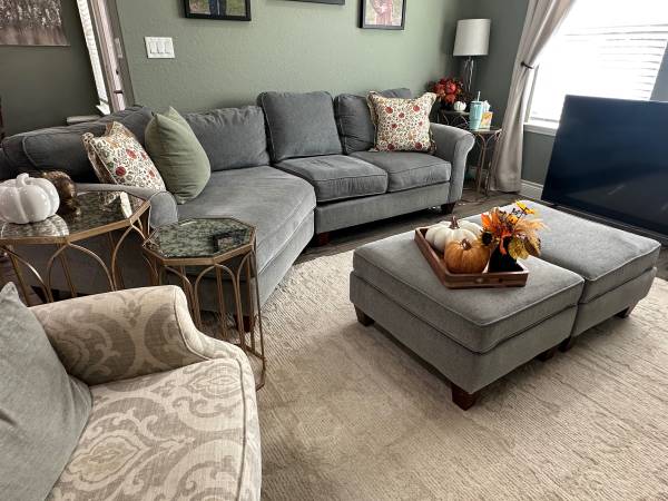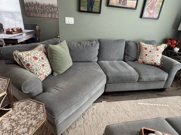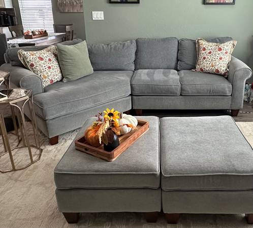 Gray cuddler sofa with 2 ottomans from Havertys. In great condition. No stains no tears no rips. Recently cleaned, smoke free home. We do have pets, but they are not allowed on the furniture.