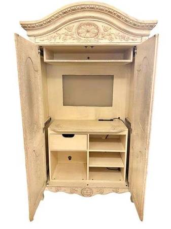 Elevate your space with this exquisite French-style media armoire by Hekman, crafted entirely from solid wood and adorned with intricate floral carvings. The elegant bonnet top and rich wood finish evoke timeless sophistication, while the thoughtfully designed interior offers modern convenience.