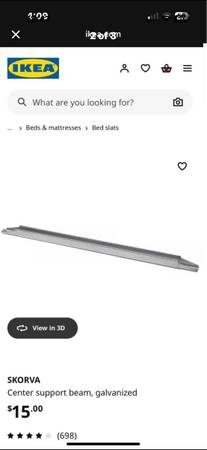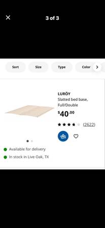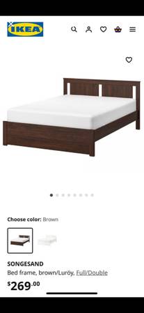 IKEA- full-size bed frame, slats and support (mattress not included). $80 for all. You can see retail price in pics.